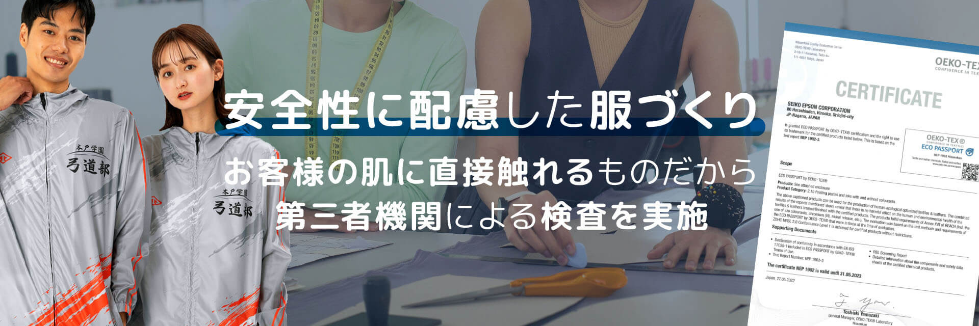 世界的なスポーツウェアメーカーの生産を行っている工場と契約しており、弊社の製品はそれらと同じ製造ラインで作られています。もちろん、染色に使うインクも専門機関で検査済みなので安心です。